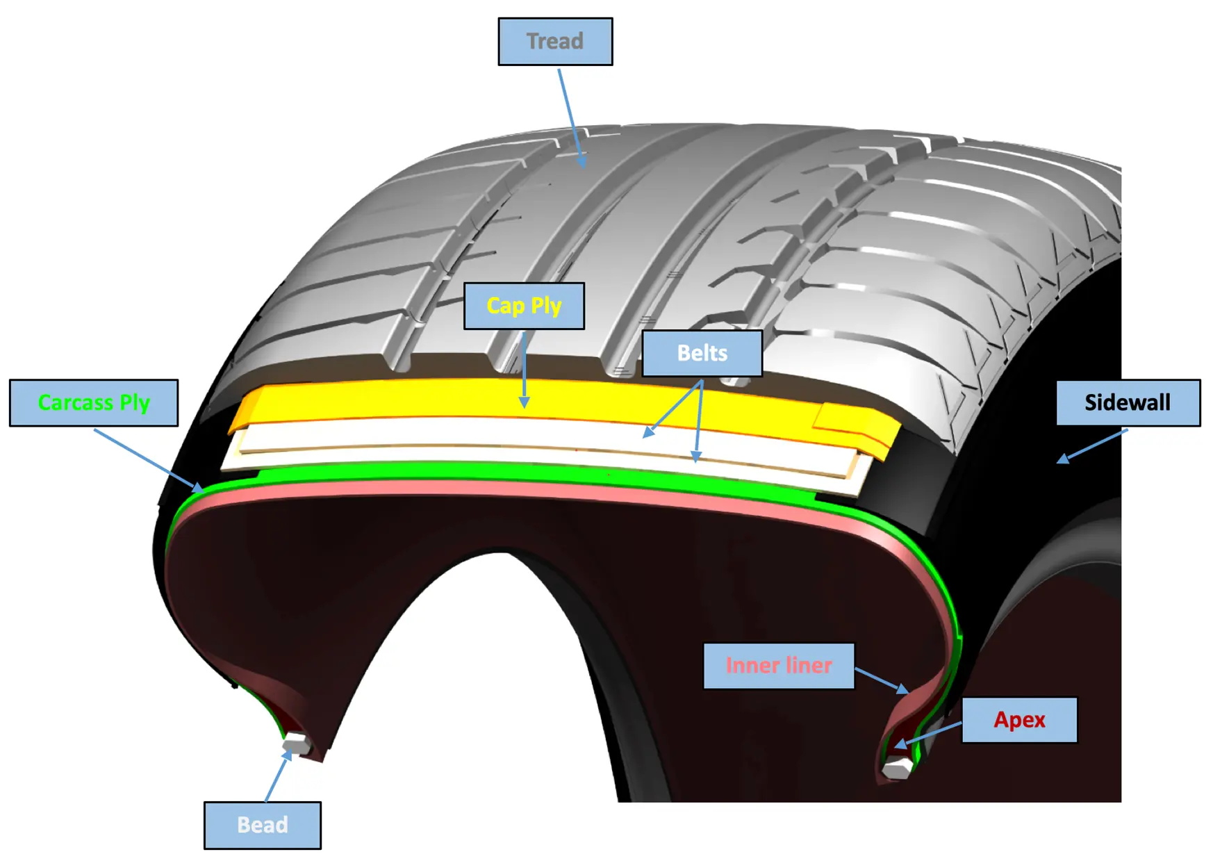 Apex (or bead filler) – the portion of harder rubber compound that sits above the bead bundle and fills the lower sidewall area, providing stiffness and stability.